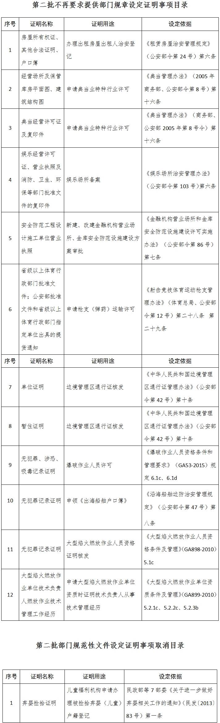 公安部关于第二批不再要求提供有关规章设定证明事项和取消有关规范性文件设定证明事项的通知
