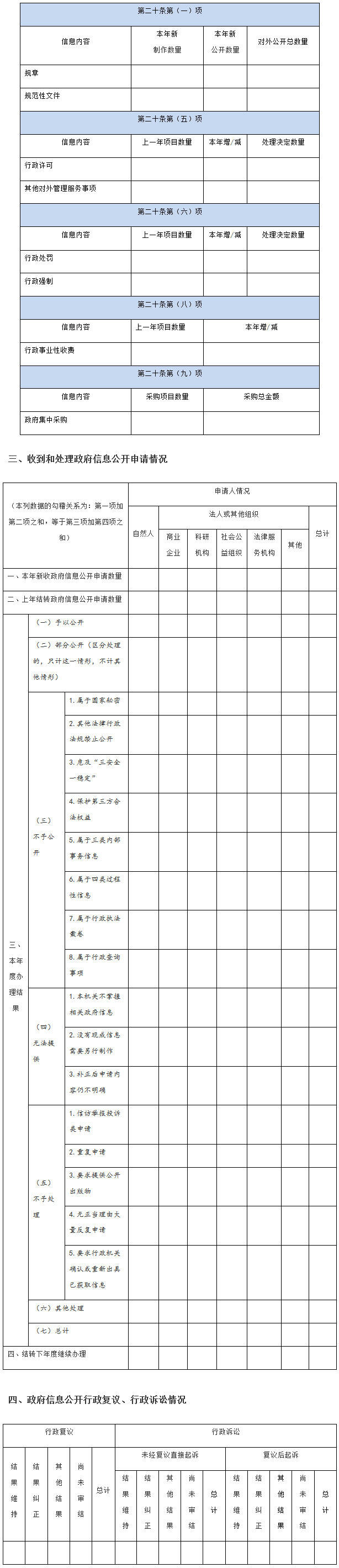 各行政机关政府信息公开工作年度报告格式模板附后。此前有关政府信息公开的各类报告和统计口径,随原政府信息公开条例的失效而失效。政府信息公开工作主管部门负责汇总的本级政府上一年度政府信息公开工作年度报告格式,参照这一格式模板办理。党的工作机关加挂行政机关牌子的单位,政府信息公开工作年度报告内容依据全国政府信息公开工作主管部门发布的有关规定(国办公开办函〔2019〕51号)确定,并参照这一格式模板办理。