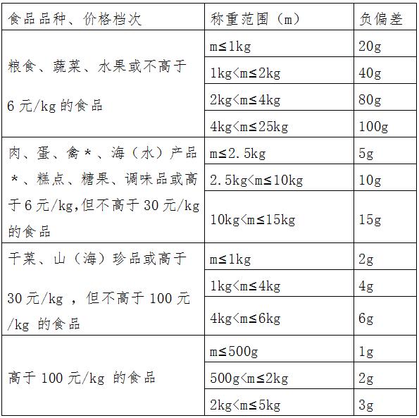 第五条 零售商品经销者使用称重计量器具每次当场称重商品,在本办法附表1、附表2称重范围内,经核称商品的实际重量值与结算重量值之差不得超过该表规定的负偏差。