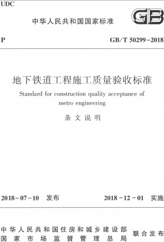 现批准《地下铁道工程施工质量验收标准》为国家标准,编号为GB/T50299-2018,自2018年12月1日起实施。原国家标准《地下铁道工程施工及验收规范》GB50299-1999同时废止。
