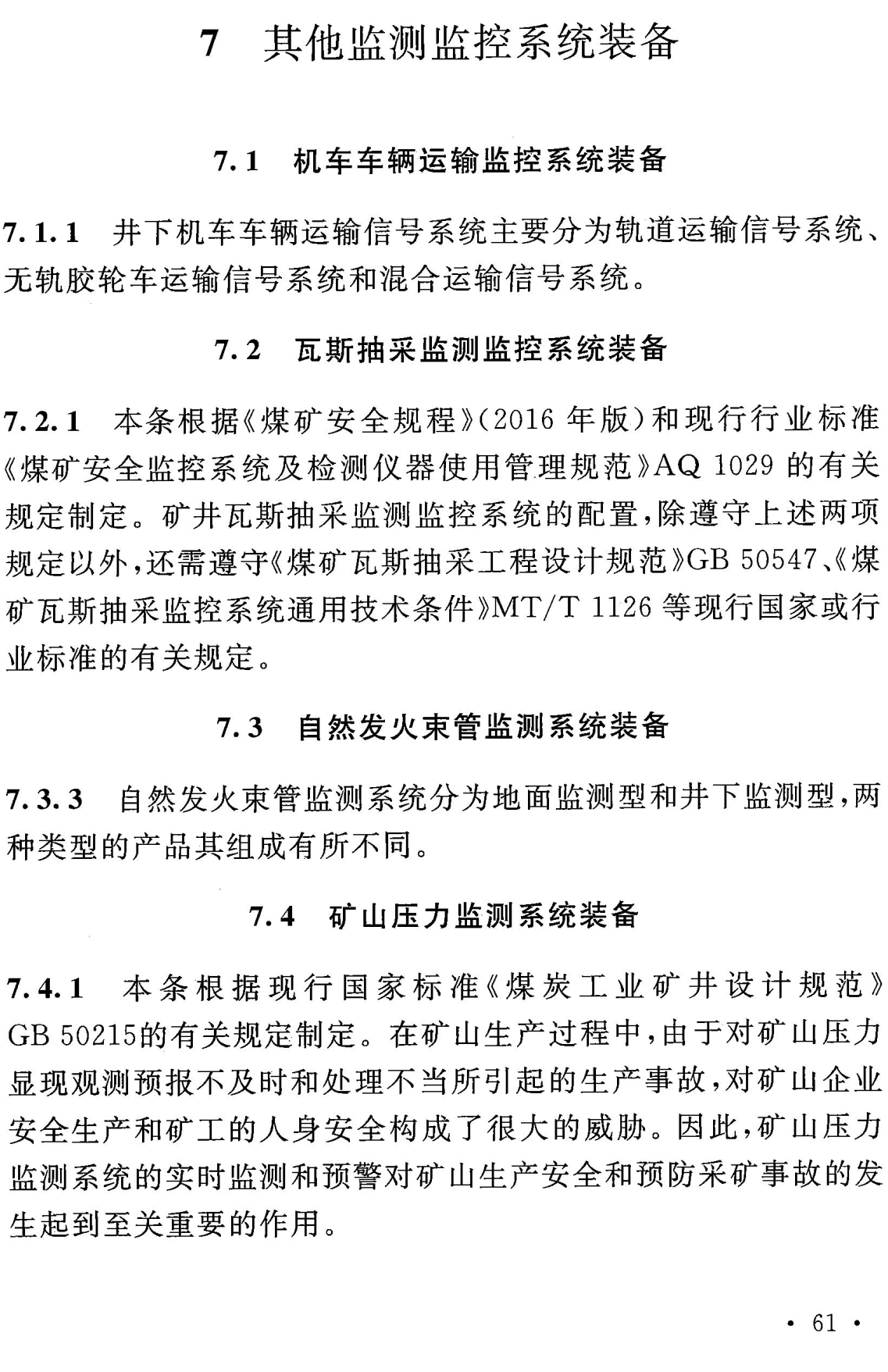 简介:为贯彻执行国家煤炭工业安全生产的法律法规和方针政策,规范矿井监测监控系统装备的工程设计,保证矿井监测监控的合理配备,提高煤矿安全生产管理水平,实现煤矿管理现代化,制定本标准。本标准适用于新建、改建和扩建的煤炭工业矿井监测监控系统装备的配备。矿井监测监控系统装备应因地制宜地采用新技术、新设备、新材料,淘汰落后设备,做到技术先进、经济合理、安全适用。矿井安全监控系统、调度通信、井下人员位置监测、应急广播、电力监控等系统的地面平台应融合,井下部分也宜融合。视频监控、无线通信、设备监控、车辆监控等系统宜融合。