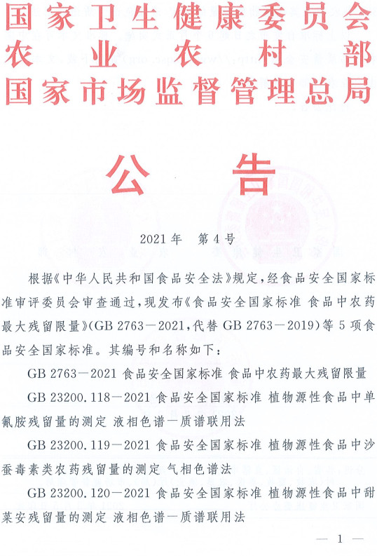标准名称:食品安全国家标准食品中农药最大残留限量