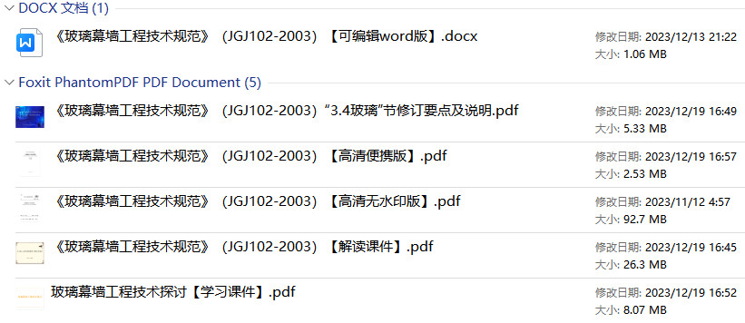 请注意:本资源压缩包内共含有3个版本:高清无水印PDF版、高清PDF便携版、可编辑Word版,附赠:1、《玻璃幕墙工程技术规范》(JGJ102-2003)【标准解读课件PDF版】2、玻璃幕墙工程技术探讨【学习课件PDF版】3、《玻璃幕墙工程技术规范》(JGJ102-2003)“3.4玻璃”节修订要点及说明【课件PDF版】;详见下图: