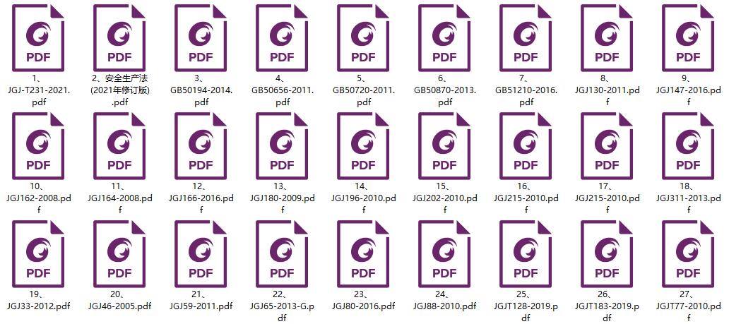 《常用建筑工程施工安全技术规范大全》 (全套共27本)【高清无水印PDF版打包下载】《常用建筑工程施工安全技术规范大全》 (全套共27本),PDF文件大小共计:528M,压缩包大小:411M.