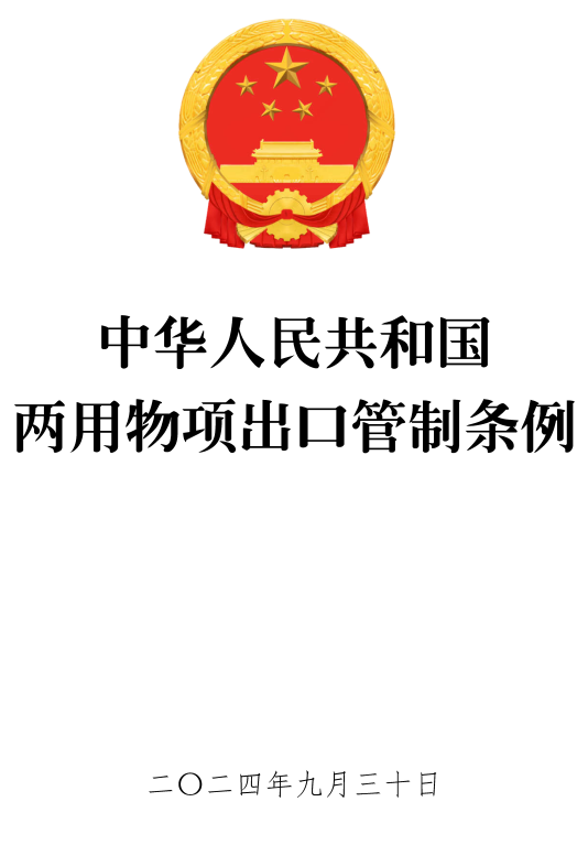 《中华人民共和国两用物项出口管制条例》已经2024年9月18日国务院第41次常务会议通过,现予公布,自2024年12月1日起施行。