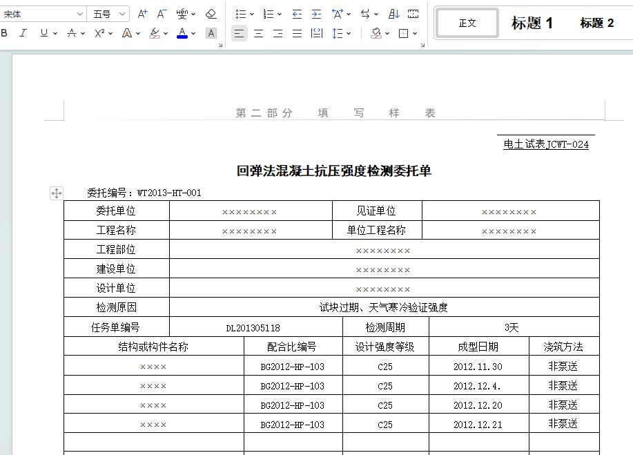 第2部分 试验》,主要包括检测委托、 检测记录和检测报告的典型表式。各试验室应遵照使用,未列入的试验项目应根据国家现行标准增加相应