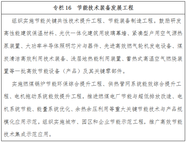 大力提升高效节能装备技术及应用水平。鼓励研发高效节能设备(产品)及关键零部件,加大示范推广力度,加速推动降低综合成本。制修订强制性能效和能耗限额标准,加快节能科技成果转化应用。发布节能产品和技术推广目录,完善节能产品政府采购政策,推动提高节能产品市场占有率。完善能效标识制度和节能产品认证制度,在工业、建筑、交通和消费品等领域实施能效领跑者制度,推动用能企业和产品制造商跨越式提高能效。