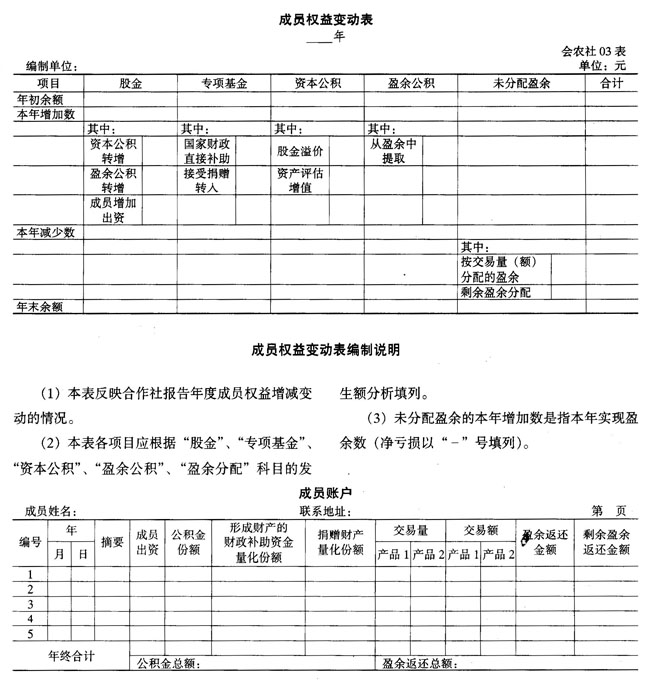 (三)资产负债表、盈余及盈余分配表和成员权益变动表格式及编制说明如下,科目余额表和收支明细表的格式及编制说明由各省、自治区、直辖市财政部门和农村经营管理部门根据本制度进行规定。