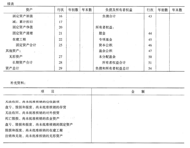 2.本表“年初数”栏内各项数字,应根据上年末资产负债表“年末数”栏内所列数字填列。如果本年度资产负债表规定的各个项目的名称和内容同上年度不相一致,应对上年末资产负债表各项目的名称和数字按照本年度的规定进行调整,填入本表“年初数”栏内,并加以书面说明。
