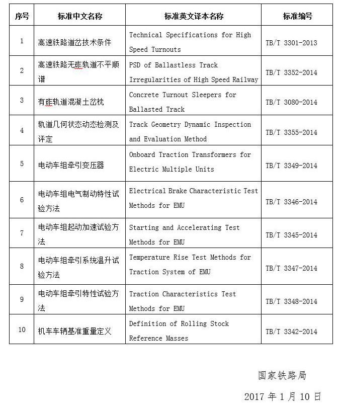 国铁科法〔2017〕6号 国家铁路局关于发布《高速铁路道岔技术条件》等10项铁道行业技术标准英文译本的公告