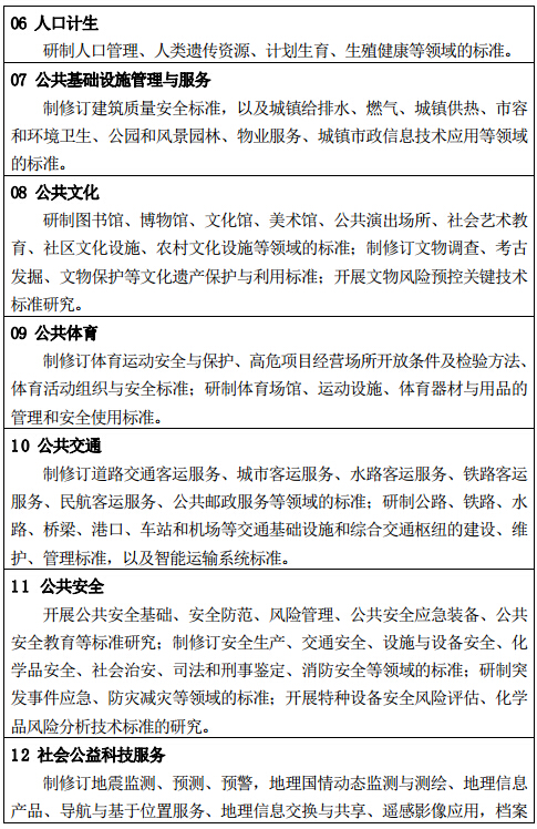 按照创新社会管理,推进基本公共服务均等化的要求,大力开展公共教育、就业服务、社会保险、基本社会服务、公共医疗卫生、人口计生、公共基础设施管理与服务、公共文化、公共交通、公共安全以及社会公益科技服务等领域的标准研究,制修订800项与人民生活密切相关的服务安全和质量标准,建立社会管理和公共服务标准体系。加强标准实施与监督,加大社会管理和公共服务重要基础标准、强制性标准的宣贯力度,选择300个具有明显资源优势、区域优势的省、市、县,开展社会管理和公共服务标准化试点,使标准成为提高社会管理与公共服务质量和政府服务绩效的有效手段,促进社会管理与公共服务水平的提升。