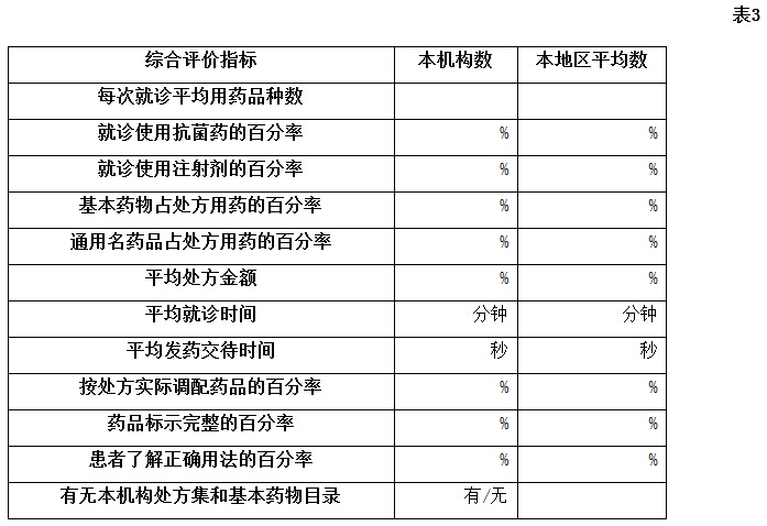 5.表3中“本地区平均数”是指本地市或者本省医疗机构各项指标的平均值,计算方法为:随机抽取本地区10—20家医院,处方总量不少于600例(张)的平均值,即抽取10家医院时,每家医院随机抽取不少于60例(张)处方,抽取20家医院时,每家医院随机抽取不少于30例(张)处方。“意见”栏由医疗机构药事管理委员会或者卫生行政部门组织的药学专家,根据各项评价指标对医疗机构药事管理或者医师处方情况提出意见、建议,某项指标严重超常时,应当提出预警信息。