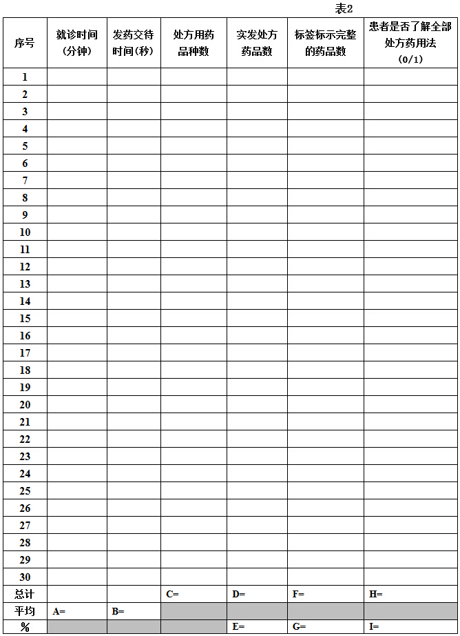 4.填写表2时,可以从门诊取药患者中随机选取30位,由调查人员现场填写。