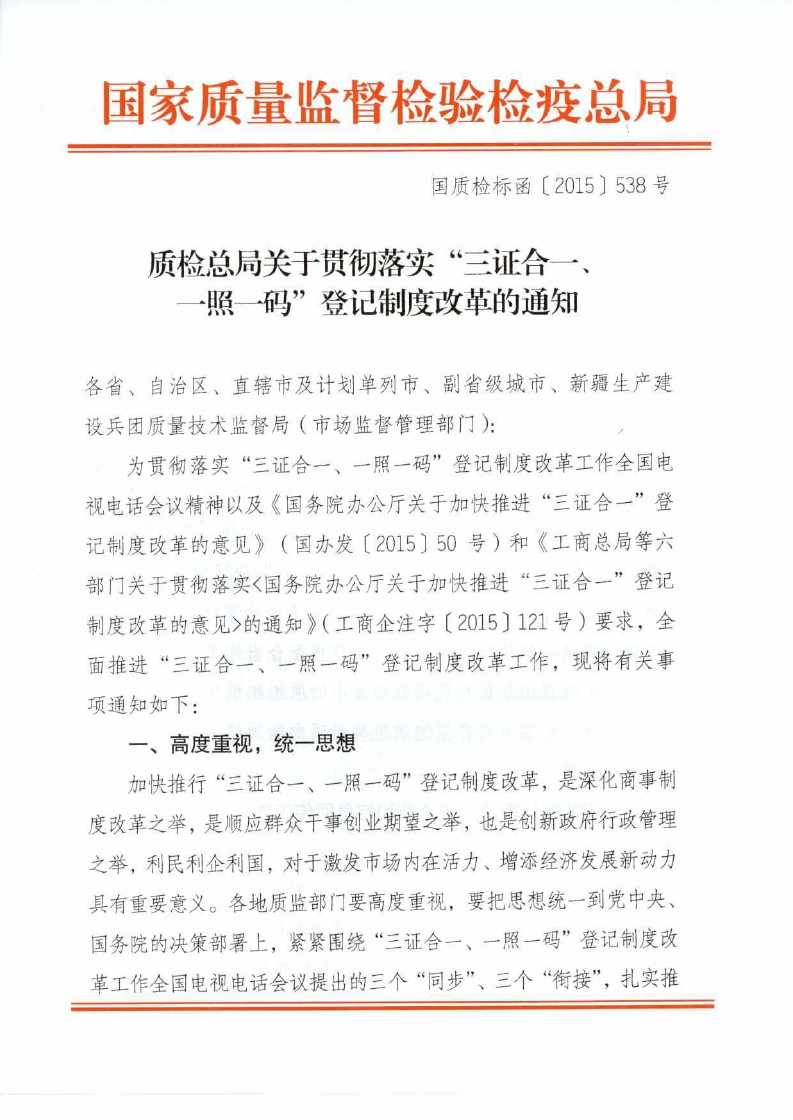 本文关键词: 国质检标函〔2015〕538号, 质检总局, 贯彻落实, 三证合一, 一照一码, 登记制度改革, 通知