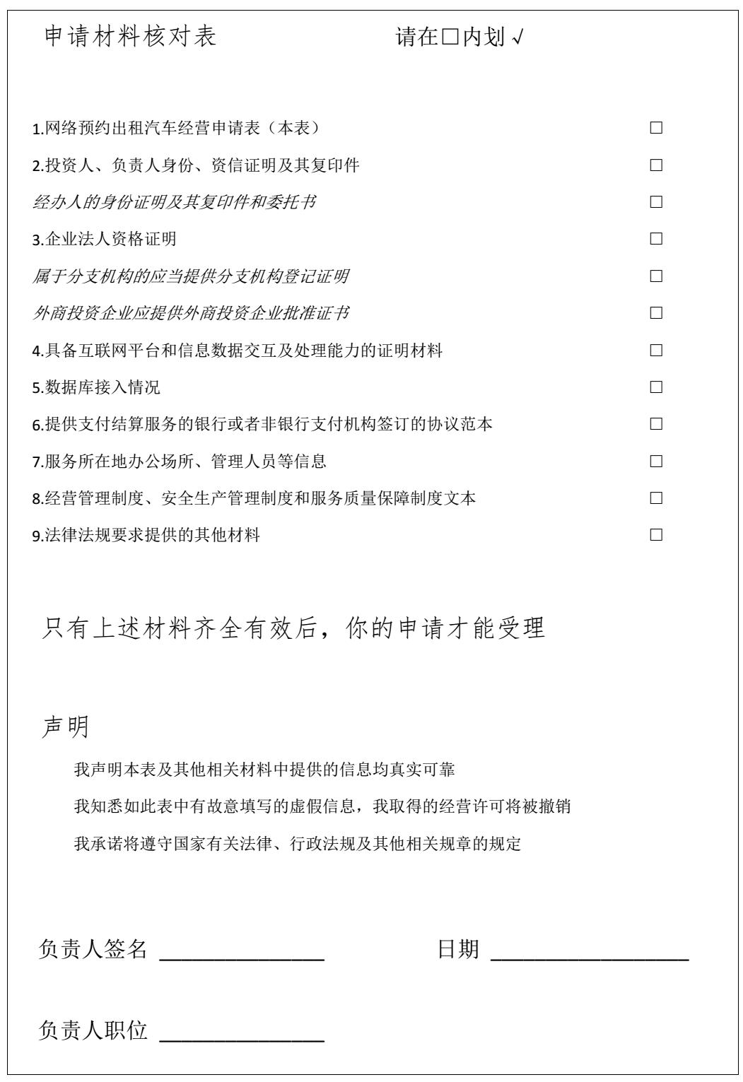 第六条 申请从事网络预约出租汽车经营的,应当根据经营区域向相应的设区的市级或者县级道路运输管理机构提出申请,并提交以下材料: