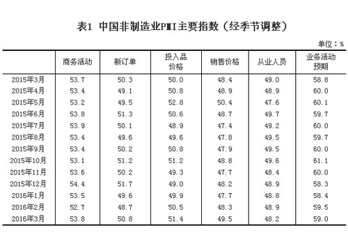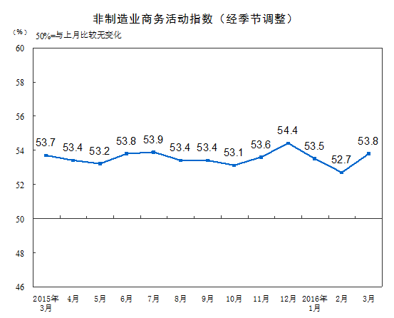 2016年3月份,中国非制造业商务活动指数为53.8%,比上月上升1.1个百分点,非制造业扩张步伐有所加快。