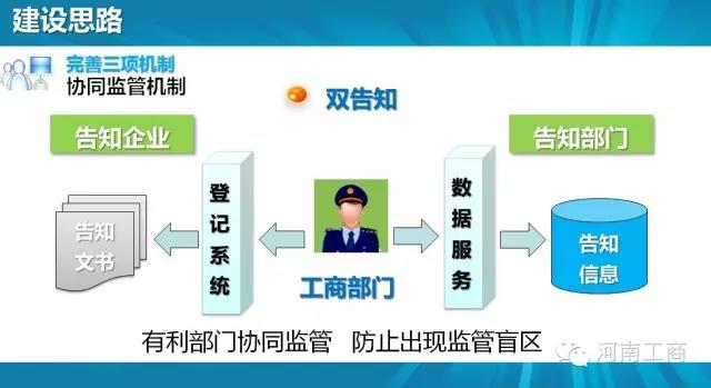 3. 双告知。实现企业告知功能,提供登记窗口人员打印告知通知书,告知企业应当办理的行政许可事项和部门,明确告知具体事项;对有明确告知部门的,实现了精确告知功能。各部门可通过协同监管平台查看认领企业并进行后续的监管,进一步加强和完善协同监管平台对企业事中事后的监管。