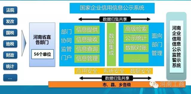 国家企业信用信息公示系统(河南),由面向社会公众的企业信用信息公示平台与面向政府各监管部门的协同监管平台两个平台构成,具有公示、监管、警示三个作用,具备公示查询功能、联动监管功能、决策辅助功能等三大功能。