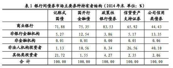 从持有者结构看,2014 年末,商业银行持债占比为 63.6%,较去年末下降 1.5 个百分点,非银行金融机构持债占比为 10.9%,较去年末下降 1.1 个百分点,非法人机构投资者及其他类投资者持债占比共为 25.6%,较去年末上升 2.6 个百分点。从公司信用类债券持有者结构看,2014 年末,商业银行、非银行金融机构、非法人机构投资者和其他类投资者的持债占比分别为 44.4%、13.4%、40.1%和 2.1%。