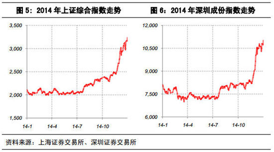 2014年,股票指数和两市成交量均大幅增长。年末,上证综合指数收于年内新高3234.68点,较去年末上涨1118.70点,涨幅为52.9%,年内最低为1991.25点。沪市全年累计成交37.7万亿元,日均成交1539.4亿元,同比增加59.1%。深圳成份指数收于年内新高11014.62点,较去年末上涨2892.84点,涨幅为35.62%,年内最低为6998.19点。深市全年累计成交36.7万亿元,日均成交1496.9亿元,同比增加49.4%。