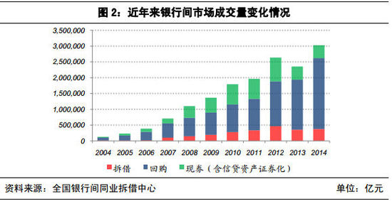 2014 年,银行间市场拆借、现券和债券回购累计成交 302.4万亿元,同比增加 28.5%。其中,银行间市场同业拆借成交 37.7万亿元,同比增加 6.0%;债券回购成交 224.4 万亿元,同比增加41.9%;现券成交 40.4 万亿元,同比减少3.0%。