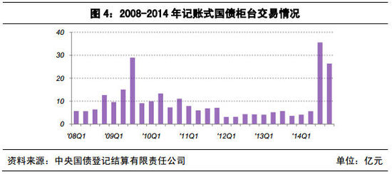 2014 年,商业银行柜台业务运行平稳。2014 年商业银行柜台新增记账式国债 21 只,国开行金融债 3 只和进出口银行债 4只。期限品种进一步丰富,包含 1 年、3 年、5 年、7 年、10 年和15 年等六个品种。2014 年,记账式国债累计成交 71.7 亿元,同比增加 283.4%,商业银行通过柜台分销国开行金融债 67 亿元,进出口银行债 30 亿元。截至 2014 年末,商业银行柜台开户数量达到 1674 万户,较上年增加 317 万户,增长 23.4%。
