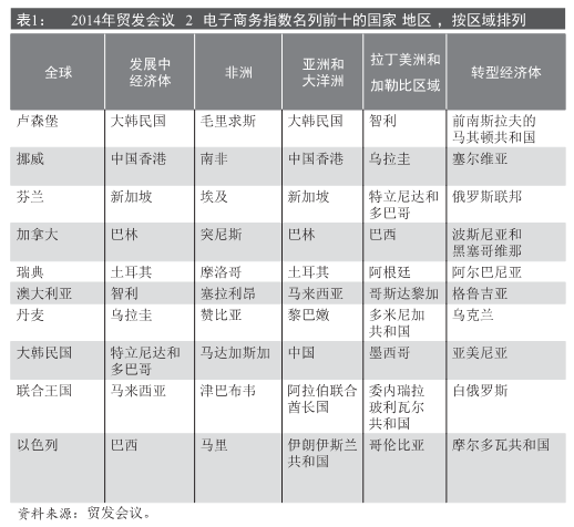 贸发会议B2C电子商务指数:一个衡量电子商务准备情况的新工具为了评估各国对电子商务的准备情况,本报告提出新的贸发会议B2C电子商务指数,涵盖了130个经济体在四个指标方面的数据:互联网的使 用情况、安全的服务器、信用卡渗透情况和邮递服务。贸发会议B2C电子商务指数与个人网上购物的比重差异之间存在强烈的正相关性。它表明,对电子商务准备最充分的是卢森堡、挪威和芬兰(表1)。在发展中经济体和新兴经济体中,名列前茅的是大韩民国、中国香港和新加坡,都位于东亚。