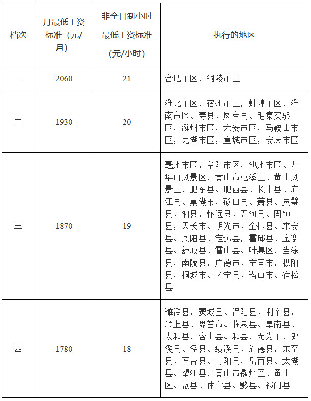 安徽省人民政府办公厅关于调整全省最低工资标准的通知