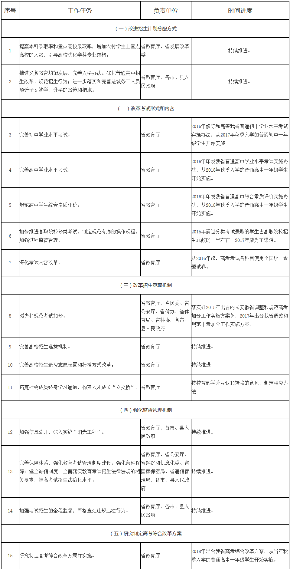 2015年启动考试招生制度综合改革,2018年全面推进,到2021年,基本建立具有中国特色、符合安徽省情的现代教育考试招生制度,形成分类考试、综合评价、多元录取的考试招生模式,健全促进公平、科学选才、监督有力的体制机制,构建衔接沟通各级各类教育、认可多种学习成果的终身学习“立交桥”。
