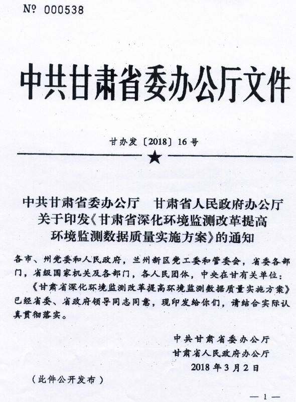 《中共甘肃省委办公厅甘肃省人民政府办公厅关于印发〈甘肃省深化环境监测改革提高环境监测数据质量实施方案〉的通知》