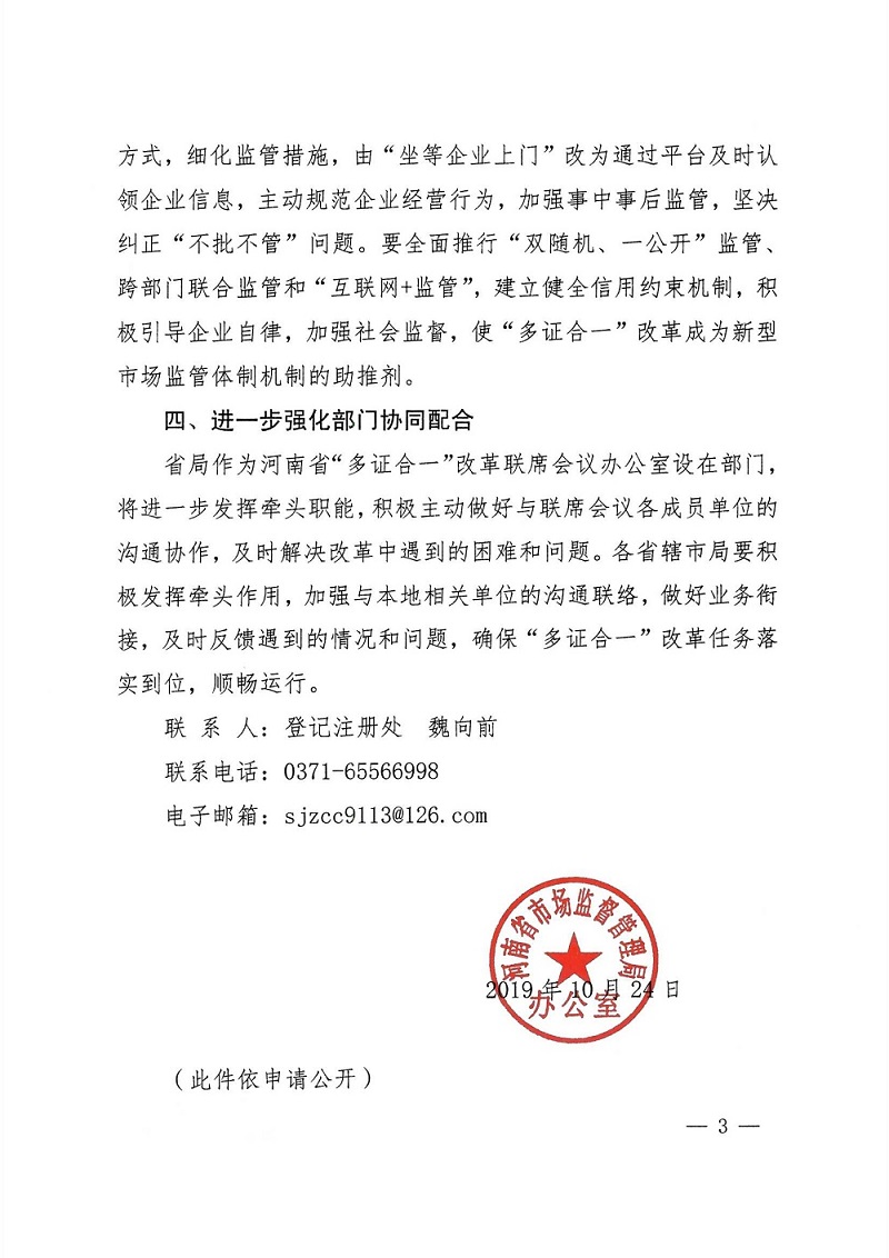 河南省市场监督管理局办公室关于进一步做好“多证合一”改革工作的通知 豫市监办〔2019〕91号