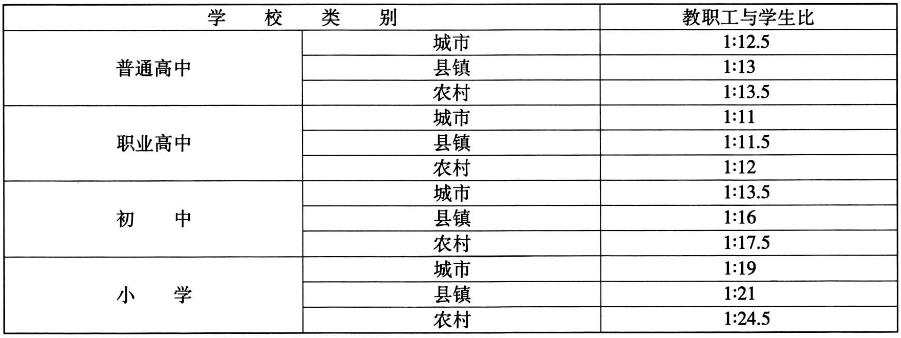 (三)合理确定教职工结构比例。中小学在核定的人员编制范围内,按照职位分类、专兼结合、一人多岗的原则,合理配备教职工,并严格按照教师资格的规定和条件聘任专任教师。职员、教学辅助人员和工勤人员占教职工的比例,普通高中一般不超过16%、职业高中一般不超过18%、初中一般不超过15%、小学一般不超过9%。有条件的学校后勤服务工作应逐步实行社会化。
