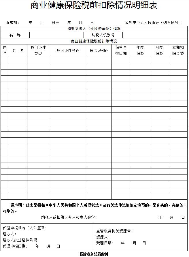 本表适用于个人购买符合规定的商业健康保险支出税前扣除申报。本表随《扣缴个人所得税报告表》《特定行业个人所得税年度申报表》《个人所得税生产经营所得纳税申报表(B表)》《个人所得税自行纳税申报表(A表)》等申报表一并报送。