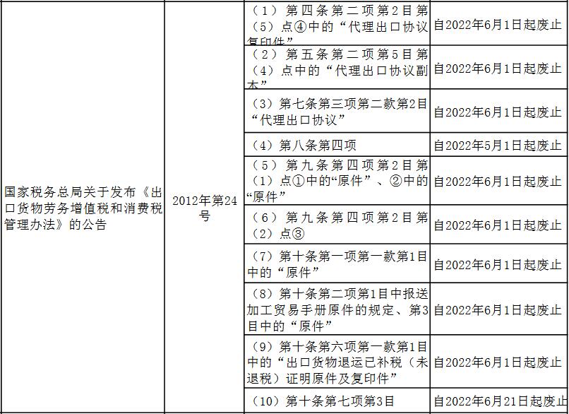 3、依据2022年4月29日发布的《国家税务总局关于进一步便利出口退税办理促进外贸平稳发展有关事项的公告》(国家税务总局公告2022年第9号),废止条款见下表: