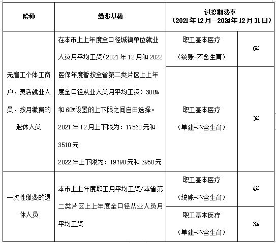 | 退休人员 | 已一次性缴纳基本医疗保险费 | 不参加补充医疗保险;或已一次性缴纳补充医疗保险费 | 不再缴纳医疗保险费,直接享受对应医疗保险待遇。 | |