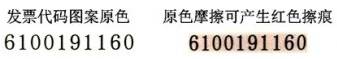 发票各联次左上方的发票代码使用防伪油墨印制,油墨印记在外力摩擦作用下可以发生颜色变化,产生红色擦痕(如下图所示)。