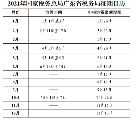 国家税务总局广东省税务局关于印发《2021年国家税务总局广东省税务局征期日历》的通知